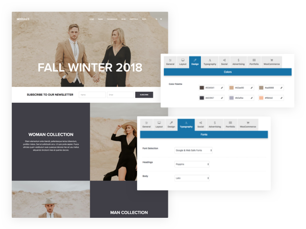 Well, our themes are just not like any other themes. They will let you set your own fonts, your own color palette, upload your logo, choose between multiple header layouts, add backgrounds, images and create unique pages by combining and customizing sections as you want.